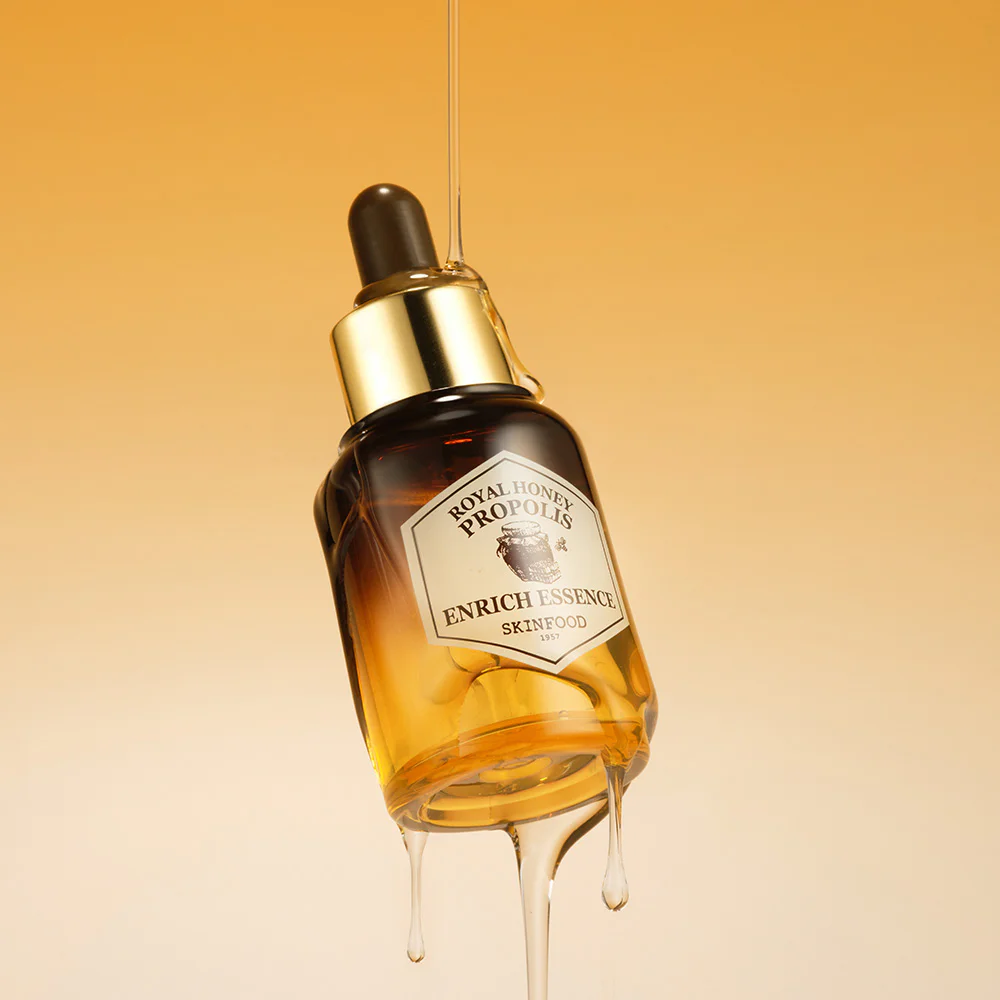 Skinfood Royal Honey Propolis Enrich Essence 20ml This moisturizing facial essence is packed with 6,316 ppm propolis extract, 1,000 ppm royal jelly extract, and 500 ppm honey extract, all using a unique extraction process. It helps condition the skin and strengthen the skin's protective barrier, while replenishing moisture and revealing strong, radiant, clear, and healthy skin.