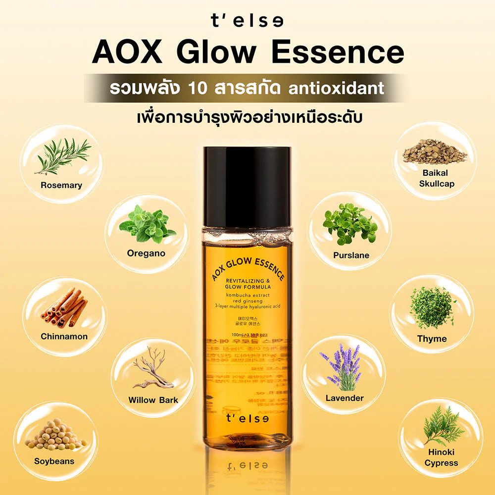 TELSE Aox Glow Essence 100ml This facial essence has a rich yet lightweight texture and is quickly absorbed. It's packed with powerful natural extracts that help replenish moisture, reduce wrinkles, brighten, and restore youthful skin.