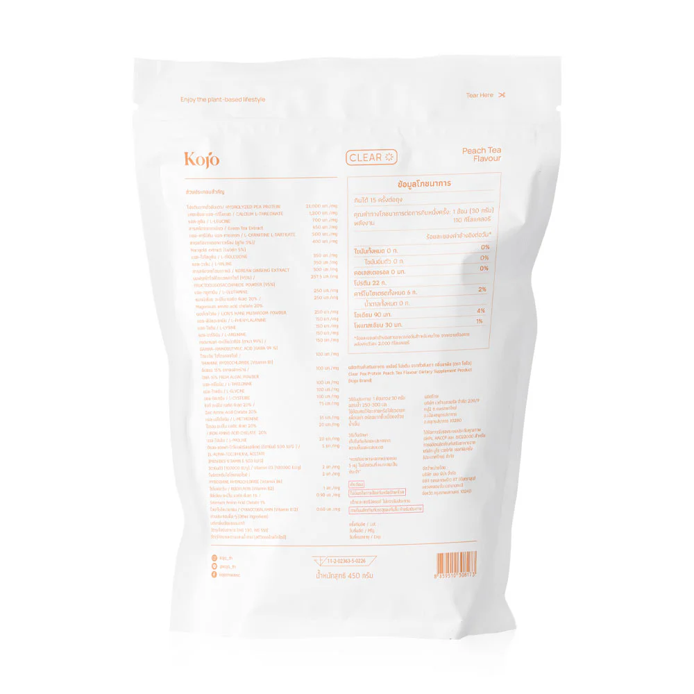 KOJO Clear Pea Protein 450g #Peach Tea Flavour Pea protein supplement with peach flavor. A clear, easy-to-drink protein powder that's light on the stomach and has a smooth, non-cloying taste. Contains all 9 essential amino acids (including BCAAs) and L-Carnitine. Sugar-free, cholesterol-free, and trans-fat-free.