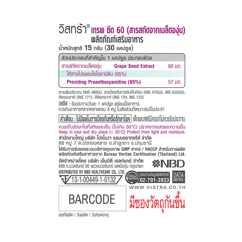 • Grape seed extract 60 mg. Provides proanthocyanidin (95%) 57 mg.