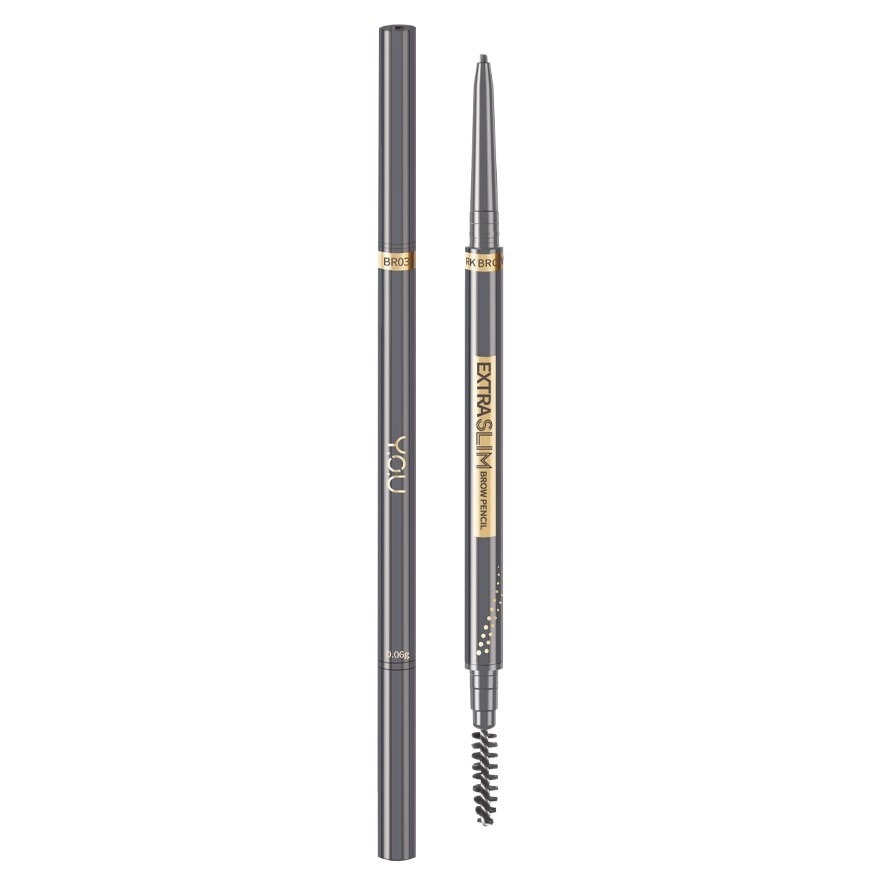 Y.O.U Extra Slim Brow Pencil is a retractable eyebrow pencil with 1.5 mm.diameter micro-tip to precisely sculpt, define and create natural fluffy brows, also Camellia Flower Extract to nourish your brows. Selling Points: 1.1.5 mm Tip for Fluffy Brows 1.5 mm slim tip pencil that easily to create fluffy hair-like strokes and deliver a precise defined brow 2.Brow Nourishing Camellia Extract:Camellia Oleifera Seed Oil derived naturally from Camellia,able to strengthen and moisturize your brows 3.Dual-ended structure: The ultra-fine tip to create precise defined strokes while the fiber spoolie easily combs to deliver a natural brow effect.