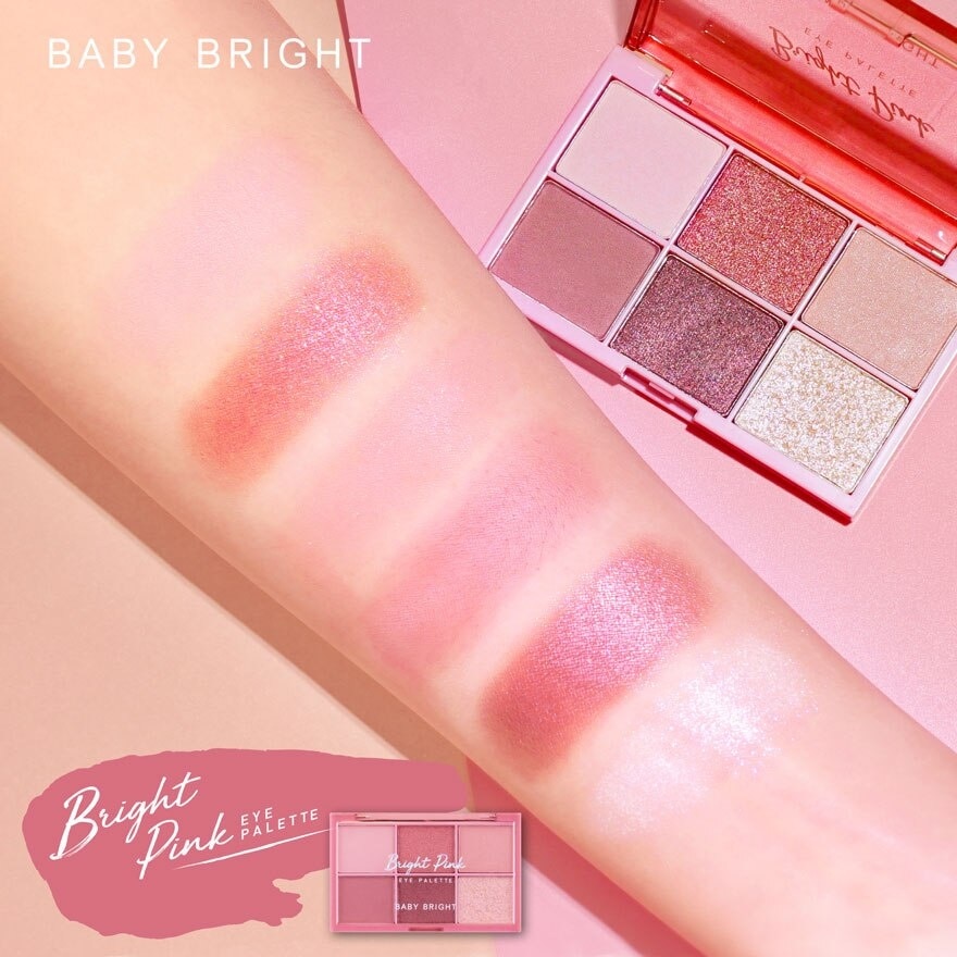 Ignite your eyes with the Baby Bright 6 Colors Eyeshadow Palette. With 3 different finishes, including pigmented matte, pearlescent shimmer, and sparkling glitter, this palette makes your eyes pop instantly thanks to its lasting, smooth, and intense pigments. Plus, anti-wrinkle pearl powder gives you naturally bright and youthful appearance. Create endless enchanting eye looks for a multitude of lifestyles using this eyeshadow palette Open the cap and use the brush to pick up a right amount of matte eyeshadow and apply onto your eyelid. Then, use darker shade, buffing it into the eye socket to add dimension. Finish off by applying shimmer or glitter eyeshadow for stunning results.