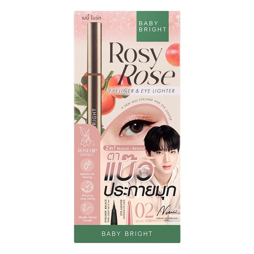 Achieve cute dewy pearl eyes with the Baby Bright Rosy Rose Eyeliner and Eye Lighter This 2in1 eyeliner tip for precise and easy application creating smooth and long lasting lines that are both waterproof and sweat proof The pearlescent eye lighter helps add a touch of sparkle to your eyes with its smooth and pigmented formula that lasts all day It is enriched with Rose Canina Extract which contains Vitamins Licopene and Beta Carotene Moreover the product also nourishes and moisturizes the delicate skin around the eyes providing a luminous look It is free from Paraben and Alcohol