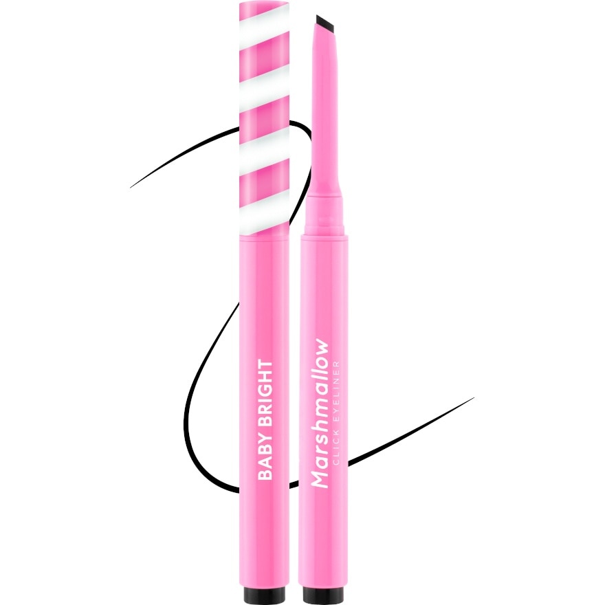 Just a click to create beautifully bold round eyes with the Baby Bright Marshmallow Click Eyeliner This creamy smooth textured liner is easy to apply and can be used as both an inliner and eyeliner for a wide eyed look Its easy grip click pen lets you create lines of any thickness from fine and precise to bold and dramatic The formula is water resistant and sweat resistant for all day wear and is 100 percent vegan Enriched with Marshmallow Root Extract and Vitamin E to soothe the skin and reduce fine lines Additionally Green Tea Leaf Extract increases moisture around eye is area Enjoy confidently bold round eyes without alcohol parabens or fragrance