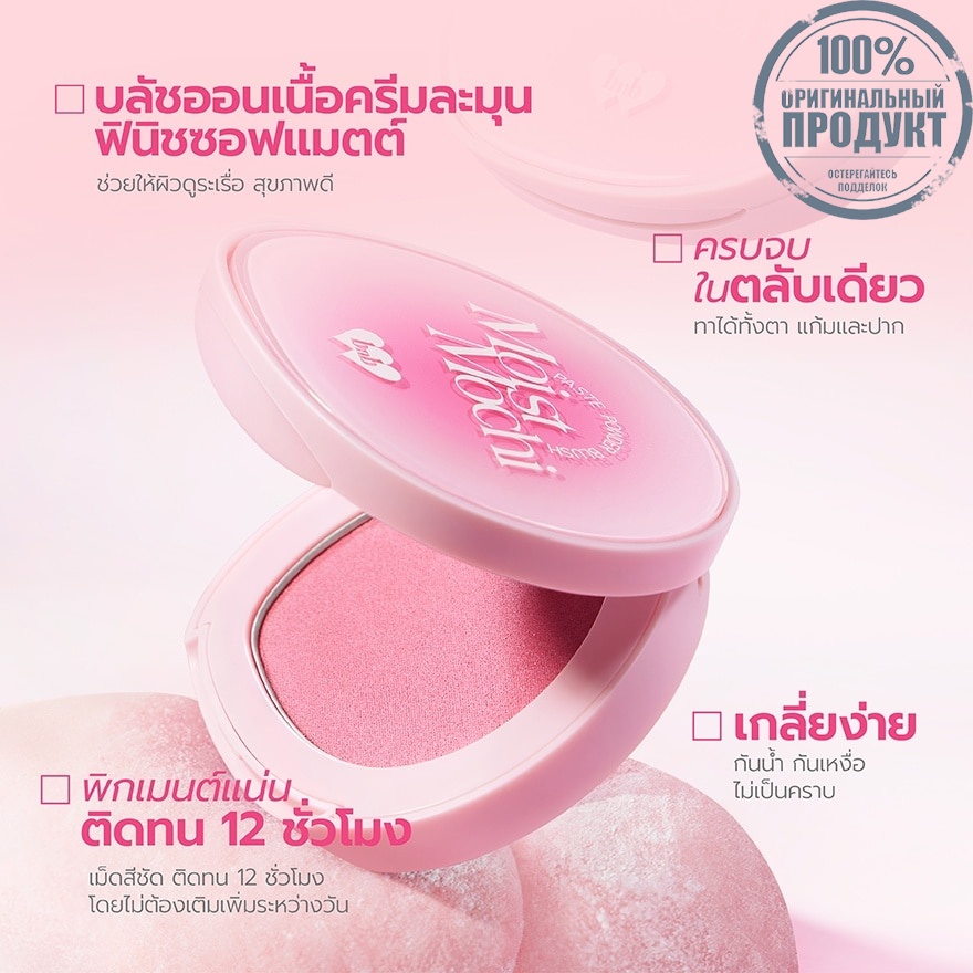 A multi use powder blush wrapped in mochi paste like form with moist, breathable, blendable, waterproof and 12H long lasting formula that melts into a second skin for a healthy glow effect.