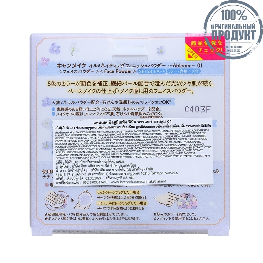 Подробное описание товара на сайте поставщика https://www.watsons.co.th/en/canmake-canmake-illuminating-finish-powder-01/p/BP_313085