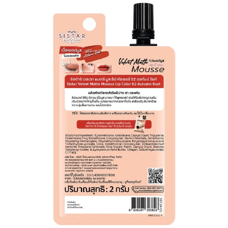 Sistar Velvet Matte Mousse Lip Color 02 Autumn Rust Lip Matt, clear color, long lasting, light mousse texture, giving a soft look, helping to make the lips look plump. Fill the mouth groove to make it look more shallow. comfortable mouth all day long Coat the lips with long-lasting moisture without falling off. Contains Hyaluron, Shea Butter, Vitamin E extracts. Can be used to decorate lips, eyes and cheeks. To increase efficiency, it should be used together with Sistar 3D Filler Hya C Serum Foundation.