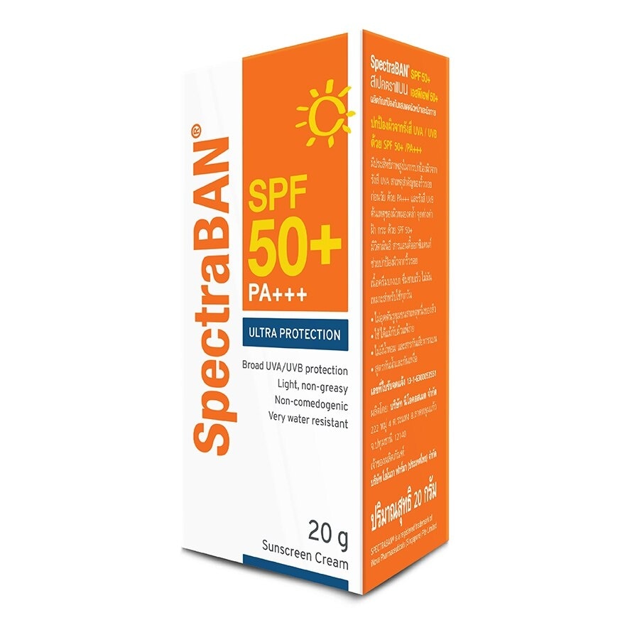 SpectraBAN SPF 50+ PA+++  ULTRA PROTECTION Sunscreen for face and body  Protect skin from UVA/UVB rays with SPF 50+ /PA+++  High protection against UVA rays, cause of photoaging, and UVB rays, cause of skin darkening, dark spots, and blemish. Contains vitamin E, an antioxidant, which helps to prevent fine lines.  Light texture. Quick absorption. Non-greasy. Suitable for daily use -    Non-comedogenic.  -    Hypoallergenic -    Free from fragrance, preservatives, and paraben -    Water and sweat resistant